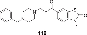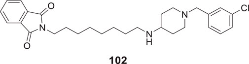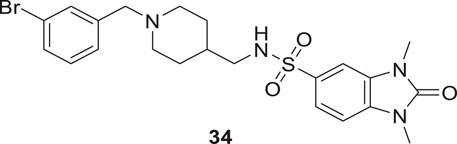 Mo et al. designed novel anti-Alzheimer’s agents linking benzyl piperidine with benzimidazolidinone ring, developing benzyl piperidine linked 1,3-dimethylbenz imidazolidinone derivatives. In-vitro cholinesterase inhibition assay demonstrated that the derivatives were good cholinesterase inhibitors. Among the derivatives, N-((1-(3-bromobenzyl)piperidin-4-yl)methyl)-1,3-dimethyl-2-oxo-2,3-dihydro-1H-benzo [d]imidazole -5-sulfonamide (34) was identified as a potent inhibitor of both AChE (IC50 = 0.39 ± 0.15 μM) and BuChE (IC50 = 0.16 ± 0.04 μM) in the sub-micromolar range. Cytotoxicity studies revealed that compound 34 is less hepatotoxic than donepezil. Considerable amelioration of cognitive impairment was observed in scopolamine-treated mice in the Morris maze test, and it also exhibited cytoprotective and antioxidant activity (Mo et al., 2020).