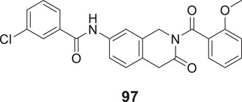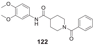 Li et al. developed a series of multipotent 2-piperidones against Alzheimer’s disease. 1-(3,4-Dimethoxybenzyl)-4-(3,5-dimethoxyphenyl)-6-(4-hydroxyphenyl)-5-nitro piperidin-2-one (65) exhibited the best concentration-dependant Aβ-self aggregation inhibition (59.11% at 20 µM) evaluated in-vitro by thioflavin T (ThT) fluorescence assay. Further, docking analysis revealed good binding to the active site of myeloid differentiation factor 88 (MyD88), preventing the dimerization of peptides. In addition, the synthesized compounds demonstrated less neurotoxicity and anti-inflammatory properties (Li L. et al., 2016).