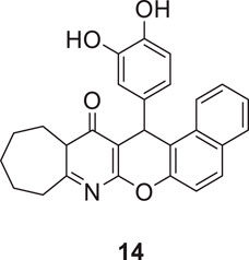 Macha et al. designed and synthesized tetrahydro-9H-benzo [5,6]chromeno [2,6-b]quinoline-13(14H)-one derivative against AChE and BuChE. The most potent inhibitory activity was shown by 15-(3,4-dihydroxyphenyl)-10,11,12,13,13a,15-hexahydrobenzo [5,6]chromeno [2,3-b]cyclohepta [e]pyridin-14(9H)-one (14) bearing 3,4-dihydroxy phenyl group at 15th position of hexahydrobenzo [5,6]chromeno [2,3-b]cyclohepta [e]pyridine-14(15H)-one scaffold against AChE (IC50 = 0.65 ± 0.06 μM) and BuChE (IC50 = 1.32 ± 0.06 μM). Compound 14 was safe with no hepatotoxicity and was equally active in behavioral studies Y maze, rectangle maze, and jumping box test compared to tacrine. A docking study revealed that the designed compounds bind well within the enzyme’s active site (Machaa et al., 2021).
