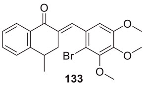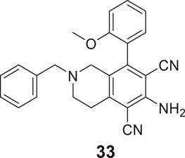 Sukumarapillai et al. developed N-benzyl piperidine-4-one derivatives as anti-Alzheimer’s agents. The compounds synthesized were mono-substituted and di-substituted, showing selective inhibition against BuChE and AChE, respectively. 6-amino-2-benzyl-8-(2-methoxyphenyl)-1,2,3,4-tetrahydroisoquinoline-5,7-dicarbonitrile (33) bearing ortho-methoxy group was potent with mixed-mode inhibitory activity against both AChE (IC50 = 5.61 ± 0.22 µM) and BuChE (IC50 = 0.87 ± 0.03 µM) compared to galantamine (AChE, IC50 = 2.09 ± 0.04 µM and BuChE IC50 = 19.34 ± 0.10 µM). Docking studies revealed that compound 33 displayed hydrophobic interaction at the catalytic triad and choline-binding sites (Sukumarapillai et al., 2016).