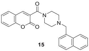Zhang et al. developed a series of novel cholinesterase inhibitors by hybridizing coumarin and piperazine pharmacophores. 3-(4-(naphthalen-1-ylmethyl)piperazine-1-carbonyl)-2H-chromen-2-one (15) was identified as a potent inhibitor against hAChE (IC50 = 8.78 ± 0.22 μM), docking study revealed that hybrids target both CAS and PAS of hAChE, also showed no cytotoxicity against neuroblastoma cells (Zhang and Jiang, 2018).