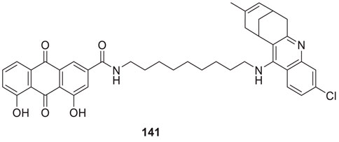 Hepnarova et al. designed novel tacrine-benzyl quinolone carboxylic acid (tacrine-BQCA) hybrids with the rationale that tacrine moiety would be responsible for AChE inhibition and BQCA have M1 receptor antagonist properties. N-(3-((6-chloro-1,2,3,4-tetrahydroacridin-9-yl)amino)propyl)-1-(4-methoxybenzyl)-4-oxo-1,4-dihydroquinoline-3-carboxamide 10 indicated a non-selective cholinesterase inhibition profile (IC50 = 0.0745 ± 0.0031 μM) with an affinity towards the M1 receptor and moderate brain permeability (Hepnarova et al., 2018).