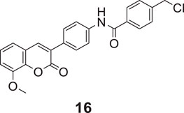 Hu et al. designed 3–(4-aminophenyl)-coumarins for AD treatment, 27 compounds were evaluated for anti-Alzheimer’s activity, and a behavioral inhibition study was performed on a model of zebrafish juveniles. 4-(Chloromethyl)-N-(4-(8-methoxy-2-oxo-2H-chromen-3-yl)phenyl)benzamide (16) exhibited the highest activity against AChE (IC50 = 0.091 ± 0.011 μM) but was slightly weaker than donepezil (IC50 = 0.012 ± 0.001 μM), and BuChE inhibitory activity (IC50 = 0.559 ± 0.017 μM) was more significant than donepezil (IC50 = 2.665 ± 0.015 μM) (Hu et al., 2019).
