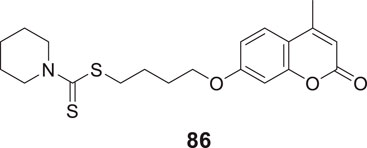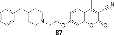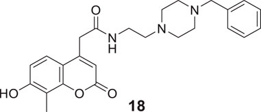 Kara et al. reported coumarin-based compounds as novel inhibitors of cholinesterase, and 2-(2-oxo-2H-chromen-4-yl) acetamide were identified as potent AChE inhibitors. Among the compounds in the series, N-(2-(4-benzylpiperazin-1-yl)ethyl)-2-(7-hydroxy-8-methyl-2-oxo-2H-chromen-4-yl)acetamide (18) depicted a good pharmacokinetic profile and high activity against both huAChE (IC50 = 0.04 ± 0.01 μM) and BuChE (IC50 = 0.68 ± 0.07 μM) than donepezil huAChE (IC50 = 0.004 ± 0.0001 μM) and BuChE (IC50 = 1.90 ± 0.02 μM). The docking study showed good interaction with the enzyme’s active site, and no hepatotoxicity was observed (Kara et al., 2019).