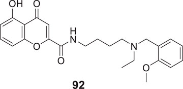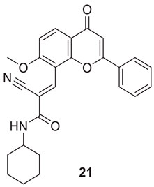 Shaikh et al. synthesized seventeen flavones-8-acrylamides and evaluated them for anti-Alzheimer activity. (E)-2-Cyano-N-cyclohexyl-3-(7-methoxy-4-oxo-2-phenyl-4H-chromen-8-yl)acrylamide (21) demonstrated higher selectivity (IC50 = 0.064 ± 0.004 µM) and inhibition than the approved cholinesterase inhibitors; galantamine and tacrine. Further, kinetic and molecular docking studies indicated that these molecules exhibit mixed inhibition. Compound 21 significantly reduces Aβ-induced toxicity. It contains the N-cyclohexyl group at the amido functional group, offering a neuroprotective effect and less toxicity to human neuroblastoma cells in all concentrations. This series of compounds also displayed anti-oxidant activity (Shaik et al., 2019).