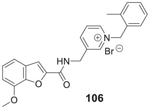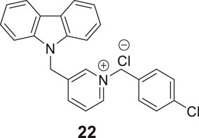 Ghobadian et al. reported N-benzyl-3-carbazolylpyridines as BuChE inhibitors. Compound 22 (3-((9H-carbazol-9-yl)methyl)-1-(4-chlorobenzyl)pyridin-1-ium chloride) (IC50 = 0.073 ± 0.003 µM) was identified as a potent and selective inhibitor of BuChE. A molecular docking study revealed a strong interaction of this compound with CAS and PAS of the enzyme with favorable physicochemical properties as a CNS drug. In addition, compound 22 demonstrated inhibition of self-induced Aβ peptide aggregation and neuroprotective activity (Ghobadian et al., 2018).