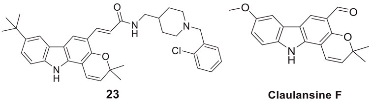 In another project by Zang et al., co-workers developed a series of Claulansine F-donepezil hybrids as multitarget drugs. Among 26 compounds studied, six compounds showed excellent AChE inhibitory activity. (E)-3-(8-(t-butyl)-3,3-dimethyl-3,11-dihydropyrano [3,2-a]carbazol-5-yl)-N-((1-(2-chlorobenzyl)piperidin-4-yl)methyl)acrylamide (23) was the most potent (IC50 = 4.34 ± 0.46 μM) and displayed the strongest in-vitro neuroprotective activity. Most importantly, 23 was able to cross BBB and also demonstrated radical scavenging activity in-vitro, proving to be a potential candidate for the treatment of AD (Zang et al., 2021).
