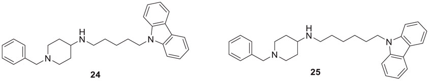 Sadeghiana et al. reported a novel series of anti-Alzheimer’s agents. In this study, they designed, synthesized, and evaluated a carbazole-benzyl piperidine hybrid for cholinesterase inhibition. N-(5-(9H-carbazol-9-yl)pentyl)-1-benzylpiperidin-4-amine (24) and N-(6-(9H-carbazol-9-yl)hexyl)-1-benzylpiperidin-4-amine (25) from this series indicated potent anticholinesterase activity. Compound 24 showed IC50 of 16.5 μM for AChE and IC50 of 0.59 μM for BuChE) and 25 showed IC50 of 26.5 μM for AChE and IC50 of 0.18 μM for BuChE. These two compounds also displayed β-secretase inhibition. Here, benzyl piperidine is linked with carbazole via a carbon chain linker. This linker with five (24) and six (25) carbon atoms exhibited good activity (Sadeghian et al., 2020).