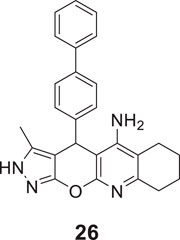 Derabli et al. developed new tacrine analogues modified with pyrano-pyrazole. Among the analogues, 4-([1,1′-biphenyl]-4-yl)-3-methyl-2,4,6,7,8,9-hexahydropyrazolo [4′,3':5,6]pyrano [2,3-b]quinolin-5-amine (26) displayed strong AChE inhibition (IC50 = 0.044 ± 0.002 μM) compared to the reference drug galantamine (IC50 = 21.82 ± 4.00 μM) (Derabli et al., 2018).