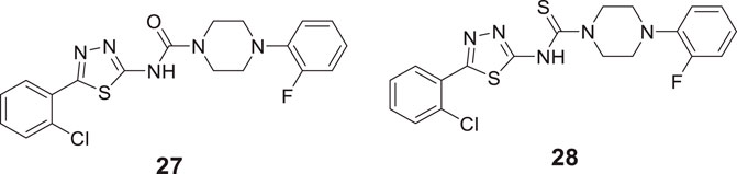 Kulshreshtha et al. studied novel urea and thiourea derivatives as cholinesterase inhibitors. Among them, N-(5-(2-chlorophenyl)-1,3,4-thiadiazol-2-yl)-4-(2-fluorophenyl)piperazine-1-carboxamide (27) (IC50 = 3.78 ± 0.63 μM) and N-(5-(2-chlorophenyl)-1,3,4-thiadiazol-2-yl)-4-(2-fluorophenyl)piperazine-1-carbothioamide (28) (IC50 = 1.51 ± 0.25 μM) showed promising activity against AChE. In-vivo, behavioral studies on scopolamine-induced animal models indicated that thiourea compound 28 was more potent than urea derivative 27 in alleviating cognition decline (Kulshreshtha and Piplani, 2018).