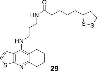 Pyridine is among the most studied heterocycles in drug design for various diseases, and also it is explored as anti-Alzheimer agent. Badran et al. applied a modern drug design strategy and developed tacrine heterodimer analogues thienopyridines, replacing the benzene ring of tacrine with bio isostere thiophene. 5-(1,2-Dithiolan-3-yl)-N-(3-((5,6,7,8-tetrahydrothieno [2,3-b]quinolin-4-yl)amino)propyl)pentanamide (29) with lipoic acid moiety exhibited higher AChE inhibitory activity (inhibition = 56.73%) than tacrine (inhibition = 54.91%). Lipoic acid moiety possesses antioxidant properties and dual binding affinity to the cholinesterase enzyme (Badran et al., 2013).