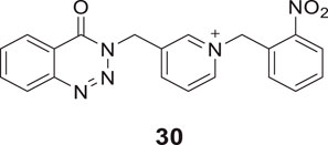 In a separate study, Hosseini et al. introduced substitution at the nitrogen atom of the pyridine ring and designed pyridinium derivatives replacing benzyl piperidine moiety of donepezil to obtain the lead compound and further modified to develop 4-oxobenzo [d]1,2,3-triazin benzyl pyridinium derivatives. Among them, 1-(2-nitrobenzyl)-3-((4-oxobenzo [d][1,2,3]triazin-3(4H)-yl)methyl)pyridin-1-ium bromide (30) with 2-nitro substitution in the benzene ring, revealed higher AChE inhibitory activity (IC50 = 0.10 ± 0.01 μM) than donepezil. Docking studies revealed that compound 30 interacted with CAS, PAS, catalytic triad, and oxyanion hole of the AChE enzyme (Hosseini et al., 2020).