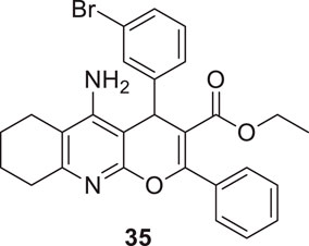 Eghtedari et al. developed tacrine-derived compounds as cholinesterase inhibitors, 5-amino-2-phenyl-4H-pyrano [2,3-b]-quinoline-3-carboxylates. Ethyl 5-amino-4-(3-bromophenyl)-2-phenyl-6,7,8,9-tetrahydro-4H-pyrano [2,3-b]quinoline-3-carboxylate (35) exhibited the most potent activity against AChE (IC50 = 0.069 ± 0.005 µM) and BuChE (IC50 = 1.35 ± 0.07 µM) that was five times more active than tacrine as evaluated by an in-vitro cholinesterase inhibition assay. The SAR by modifying substituents at the fourth position of pyrano moiety with substituted-phenyl ring revealed that electron-withdrawing groups such as chloro and bromo at ortho and meta positions improve the cholinesterase inhibitory potential of the compounds. The toxicity studies on HepG2 cells indicated that these compounds were less cytotoxic than tacrine (Eghtedari et al., 2017).