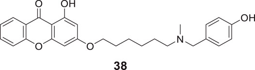 In another study, Zhang et al. developed novel xanthone-alkyl benzylamine hybrids with an alkyl linker and 1-hydroxy-3-((6-((4-hydroxybenzyl) (methyl)amino)hexyl)oxy)-9H-xanthen-9-one (38) was identified as the most potent AChE inhibitor (IC50 = 0.85 ± 0.043 μM) with balanced dual cholinesterase inhibition. Kinetic analysis and docking studies indicated compound 38 was a mixed type of inhibitor for AChE and BuChE with good blood-brain barrier (BBB) penetrability and antioxidant properties equivalent to trolox. Additionally, memory function improvement was observed in scopolamine-induced amnesia mice (Zhang Z. et al., 2021).