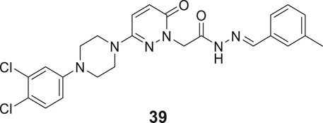 Ozdemir et al. reported the design and synthesis of 6-substituted-3(2H)-pyridazine-2-acetyl-2-(p-substituted benzalhydrazone) derivatives as potent dual cholinesterase inhibitors. (E)-2-(3-(4-(3,4-dichlorophenyl)piperazin-1-yl)-6-oxopyridazin-1(6H)-yl)-N'-(3-methylbenzylidene) acetohydrazide (39) was the most potent compound among the synthesized derivatives for AChE inhibition (IC50 = 75.52 ± 1.76%) and BuChE (IC50 = 62.03 ± 1.82%). Docking studies demonstrated that its binding interactions in AChE active sites were similar to those of the known inhibitors. However, it did not show binding abilities to the active site of BuChE (Özdemir et al., 2017).