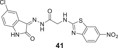 Tripathi et al. developed 2-amino-6-nitrobenzothiazole-derived hydrazones as AChE inhibitors. (Z)-N'-(5-chloro-2-oxoindolin-3-ylidene)-2-((6-nitrobenzo [d]thiazol-2-yl)amino) acetohydrazide (41) indicated six-fold potency against AChE (IC50 = 0.0035 ± 0.005 µM) than donepezil and tacrine. This compound demonstrated mixed-type reversible enzyme inhibition with a good docking score. Further, the radical scavenging ability of the active molecules was higher as confirmed by α,α-diphenyl-β-picrylhydrazyl (DPPH) radical scavenging assay (Tripathi and Ayyannan, 2018).
