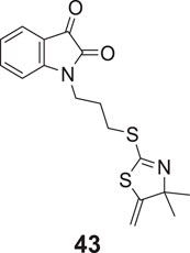 Davis et al. designed a novel series of isatin-linked 4,4-dimethyl-5-methylene-4,4-dihydro thiazole-2-thiols as AChE inhibitors. 1-(3-((4,4-Dimethyl-5-methylene-4,5-dihydrothiazol-2-yl)thio)propyl)indoline-2,3-dione (43) was the most potent inhibitor (IC50 = 18.2 ± 1.2 μM) and the potency was similar to galantamine. Kinetic studies indicated that compound 43 was a non-competitive reversible inhibitor, whereas molecular modeling indicated interaction with AChE active site. Isatin moiety showed interaction with CAS and 2-thiazoline moiety with PAS of AChE (Davis and Eckroat, 2021).