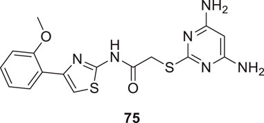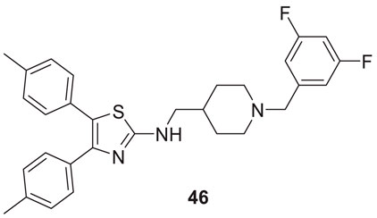 Shidore et al. synthesized novel molecules by fusing cholinesterase inhibitor donepezil and diaryl thiazole. N-((1-(3,5-difluorobenzyl)piperidin-4-yl)methyl)-4,5-di-p-tolylthiazol-2-amine (46) of the series exhibited potent anti-cholinesterase activity with IC50 of 0.30 ± 0.01 µM against AChE, and IC50 = 1.84 ± 0.03 µM against BuChE. In addition, compound 46 also showed in-vitro anti-oxidant and anti-apoptotic properties (Shidore et al., 2016).