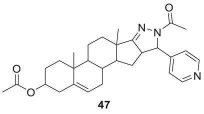 Singh et al. synthesized and evaluated pyrazolyl-substituted steroids as neuroprotective agents. Dehydroepiandrosterone is a steroid used to treat neurodegenerative disorders such as Alzheimer’s and Parkinson’s disease, which is substituted at the 16th and 17th positions with the pyrazolinyl group. 10-acetyl-6a,8a-dimethyl-11-(pyridin-4-yl)-1,3,4,5,6,6a,6b,7,8,8a,10,11, 11a,12,12a,12b-hexadecahydronaphtho [2′,1':4,5]indeno [1,2-c]pyrazol-4-yl acetate (47) displays potent neuroprotection with inhibition of AChE with micro moles of AChE/min/mg protein (0.0027 ± 0.0006) (Singh R. et al., 2018).
