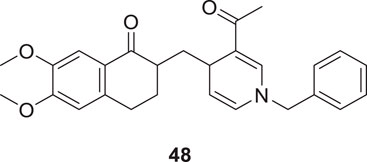Tintas et al. synthesized and evaluated 1,4-dihydropyridine derivatives with significant AChE inhibition. 2-((3-Acetyl-1-benzyl-1,4-dihydropyridin-4-yl)methyl)-6,7-dimethoxy-3,4-dihydronaphthalen-1(2H)-one (48) displayed a good AChE inhibitory activity (IC50 = 0.173 µM). These are chiral 1,4-dihydropyridine derivatives that exhibited selectivity for AChE (Ţînţaş et al., 2018).