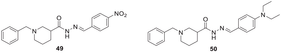 Parlar et al. designed, synthesized, and evaluated a series of N-benzylpiperidine-3/4-carbohydrazone derivatives for AChE inhibition. These SAR studies showed that the phenyl-substituted compound displayed selectivity for AChE binding. (E)-1-benzyl-N′-(4-nitrobenzylidene)piperidine-3-carbohydrazide (49) and (E)-1-benzyl-N′-(4-(diethylamino) benzylidene)piperidine-3-carbohydrazide (50) demonstrated the most potent activity in the given series of derivatives. Compound 49 indicated better in-vitro AChE inhibition with IC50 = 5.68 μM, and compound 50 diethylamino derivative exhibited AChE inhibition with IC50 = 0.81 μM. It also showed Aβ42 self-aggregation inhibition and anti-oxidant properties (Parlar et al., 2019).