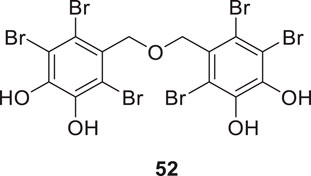 The marine ecosystem has a vast amount of different and unique bioactive secondary metabolites. Paudel et al. extracted bromophenols from red algae called Symphyocladia latiuscula Yamada. Further, they evaluated their biological activity against AChE and BuChE. Among all the extracted compounds, 5,5′-(oxybis (methylene))bis (3,4,6-tribromobenzene-1,2-diol) (52) indicated potent inhibition of the cholinesterase enzyme with a Ki value of 0.6 μM for AChE and 0.37 μM for BuChE inhibition. The OH groups in the structure exhibit hydrogen bond interaction with the enzyme revealed by the docking study. It also inhibits Aβ aggregation (Paudel et al., 2019).