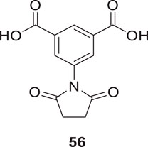 Altamirano-Espino et al. synthesized aminoisophthalic acid derivatives to inhibit acetylcholinesterase with fewer side effects. They have synthesized ten derivatives and evaluated them for AChE inhibition in-vitro and in silico. According to the docking simulation study, electron-poor aminobenzoic acid derivatives show better inhibition than electron-rich ones. However, when a heterocyclic ring is substituted in place of a linear group, it creates a π-π stacking interaction between the aromatic ring and an amino acid in the enzyme, resulting in a lower Ki value. The in-vitro assessment indicates that the derivative with a succinimide substitution compound, 5-(2,5-dioxopyrrolidin-1-yl)isophthalic acid (56), displays the lowest Ki value of 73 µM compared to the other compounds tested (Altamirano-Espino et al., 2020).