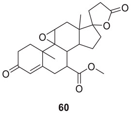 Hira et al. studied the potential aldosterone antagonist eplerenone, methyl 4a,6a-dimethyl-2,5′-dioxo-2,4,4a,4′,5a,5′,6,6a,8,9,9a,9b,10,11-tetradecahydro-3H,3′H-spiro [cyclopenta [1,2] phenanthro [4,4a-b]oxirene-7,2′-furan]-10-carboxylate, (60) for the treatment of Alzheimer’s disease. In-vivo and in silico studies showed that eplerenone is an effective drug for reversing STZ (streptozotocin)-induced memory impairment. It may be helpful in the treatment of Alzheimer’s disease and dementia (Hira et al., 2020).