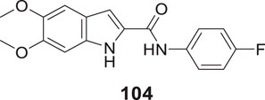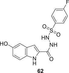 Taha et al. also synthesized the sulfonamide derivatives based on indole as a basic moiety. From this series, 4-fluoro-N'-(5-hydroxy-1H-indole-2-carbonyl)benzenesulfonohydrazide (62) displayed significant inhibition of AChE with an IC50 value 0.17 ± 0.02 µM. According to the docking study, the sulfonamide group interacts with the active site residues via hydrogen bonding, while the indole aromatic ring forms a π-π interaction. Additionally, the fluorine on the aromatic ring is observed to exhibit an interaction (Taha et al., 2021).