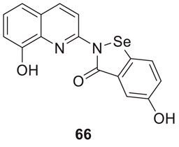 In another study, Wang et al. designed and synthesized 8-hydroxyquinolines bearing (benzo[d][1,2]selenazol-3(2H)-one) substitution at second position for the treatment of Alzheimer’s disease. Interestingly, 5-hydroxy-2-(8-hydroxyquinolin-2-yl)benzo [d][1,2] selenazol-3(2H)-one (66) demonstrated inhibition of Cu (II)-induced Aβ aggregation among the derivatives confirmed by ThT fluorescence assay. This compound also showed a good radical scavenging activity (2.6 ± 0.3 µM min-1) in oxygen radical absorbance capacity (ORAC FL) assay (Wang et al., 2016).