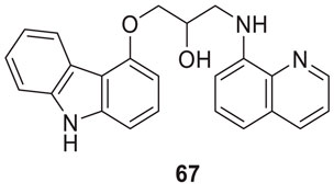 Interestingly, Zang et al. also explored a quinoline scaffold and developed a 4-hydroxy carbazole-8-aminoquinoline dimer, 1-((9H-carbazol-4-yl)oxy)-3-(quinolin-8-ylamino)propan-2-ol (67) as copper-induced Aβ aggregation inhibitor and reported 22.9% inhibition in ThT fluorescence assay. In addition, compound 67 exhibited good copper selective inhibition and neuroprotective effect against Glu-induced cell death in HT22 cells at 10 µM (Zhang et al., 2018).