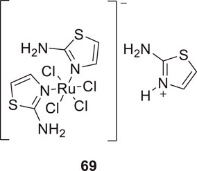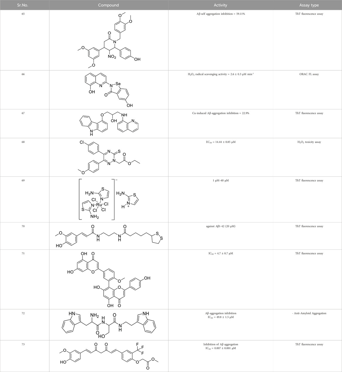 Plexes are an attractive class of drug discovery. Messori et al. studied ruthenium (III) complexes as an anti-Alzheimer’s agent having potent Aβ blocking properties. Among three metal complexes studied, (69) displayed potent activity against Aβ aggregation in-vitro, and this study confirmed PMRU20 at 20 μM as an effective neuroprotective agent (Messori et al., 2013).