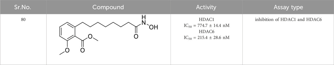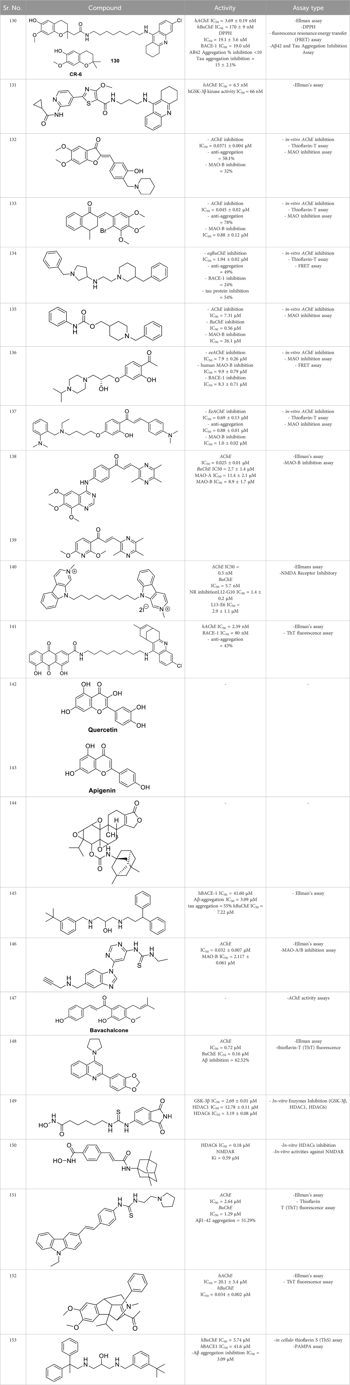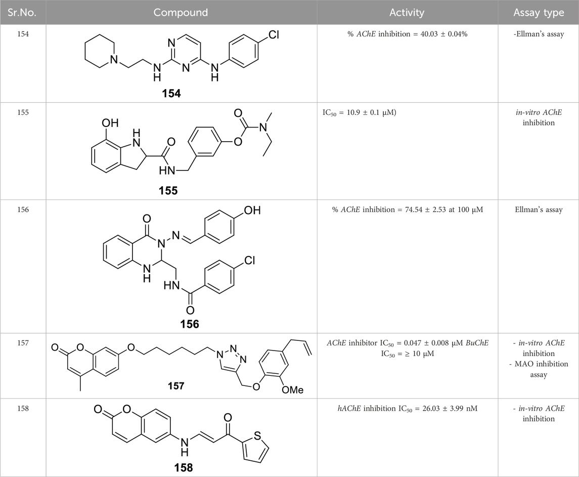 Murtaza et al. designed, synthesized, and evaluated a set of 2-aminobenzohydrazide and 2,3-dihydroquinazolin-4(1H)-one derivative as anti-cholinesterase agents. (E)-2,5-dichloro-N-(2-(2-(4-hydroxy-3-methoxybenzylidene)hydrazine-1-carbonyl)phenyl)benzene sulfonamide (64) shows dual inhibition of AChE and BuChE with IC50 values of 0.12 ± 0.03 µM and 0.13 ± 1.75 µM, respectively. A molecular docking study revealed that the three aromatic rings in 64 make π-π interaction with amino acids at the active site of cholinesterase. Relative to the preceding compound, heteroatoms exhibit distinct hydrogen bond interactions with amino acids. The molecule’s electronegative density is a crucial determinant of its binding capability. Additionally, this derivative displays a neuroprotective effect (Murtaza et al., 2022). See Supplementary Table 1 for a summary of cholinesterase inhibitors.