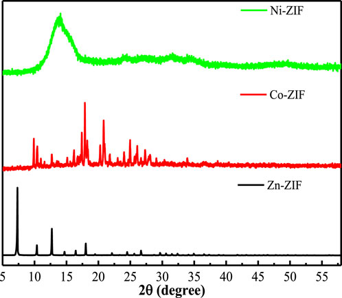 ZIFs characterization and results. XRD characterization was performed to analyze the crystallinity of ZIFs with different metal centers (Figure 1). The diffraction patterns revealed distinct crystalline structures for each variant. Zn-ZIF displayed characteristic Bragg reflections at 2θ = 5.16°, 10.52°, 12.78°, 14.92°, 16.64°, 18.24°, 24.66°, 26.90°, 28.22°, 31.37°, and 33.33° (Aboraia et al., 2020; Liu et al., 2015), consistent with its reported crystalline structure. Co-ZIF exhibited diffraction peaks at 2θ = 7.4°, 10.4°, 12.7°, 14.8°, 16.5°, 18.0°, 22.1°, 24.5°, 25.5°, 26.7°, 29.5°, 30.6°, and 32.5° (Guo et al., 2016; Liu et al., 2021), confirming successful formation of the Co-based framework. Ni-ZIF demonstrated three prominent peaks at 2θ = 9.0°, 15.7°, and 16.8° (Yang and Bai, 2019), indicating its distinct crystalline arrangement compared to Zn and Co analogs.