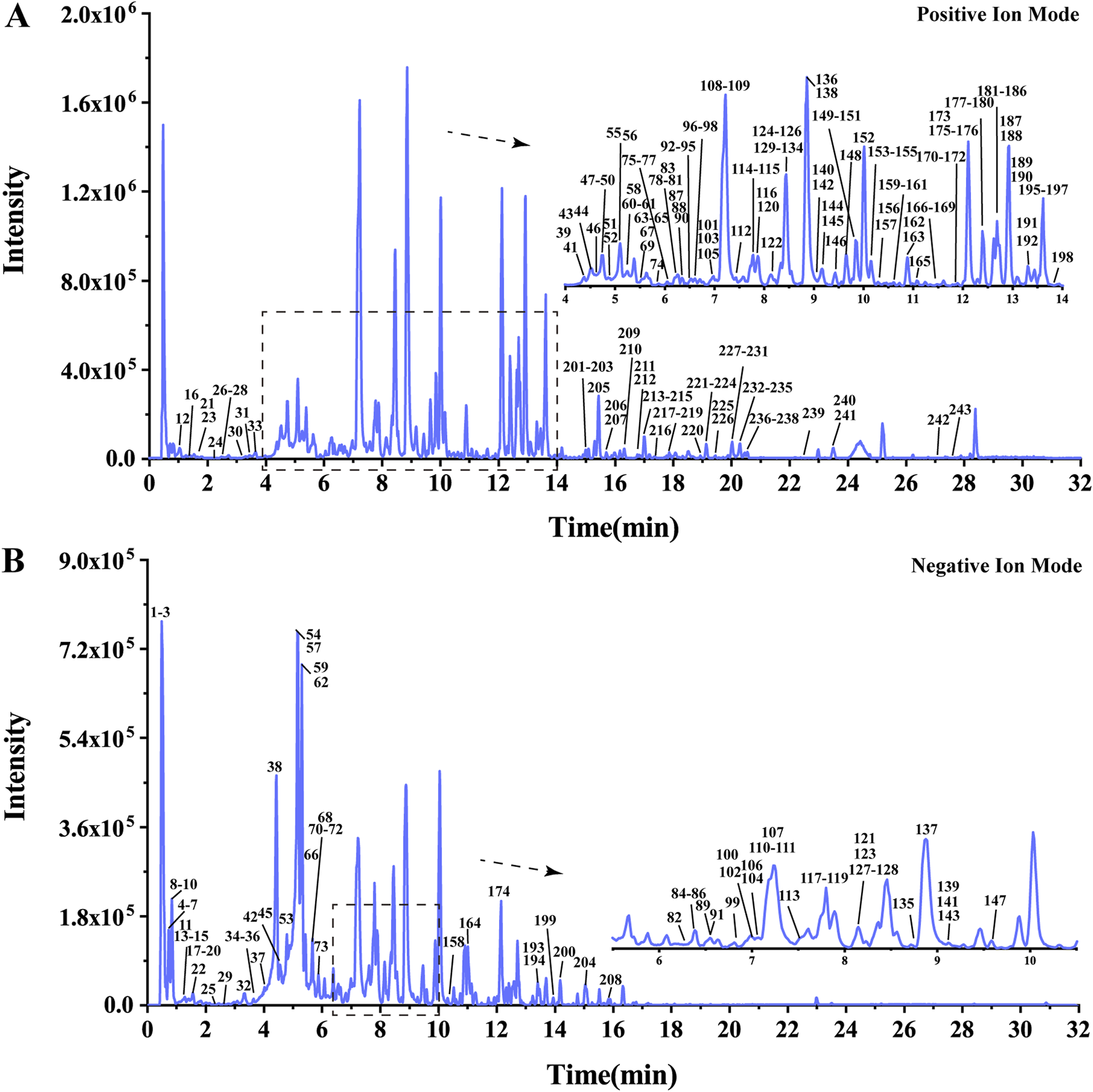 Base peak chromatogram (BPC) of ASDZL in UHPLC-HRMS positive (A) and negative (B) ion modes.