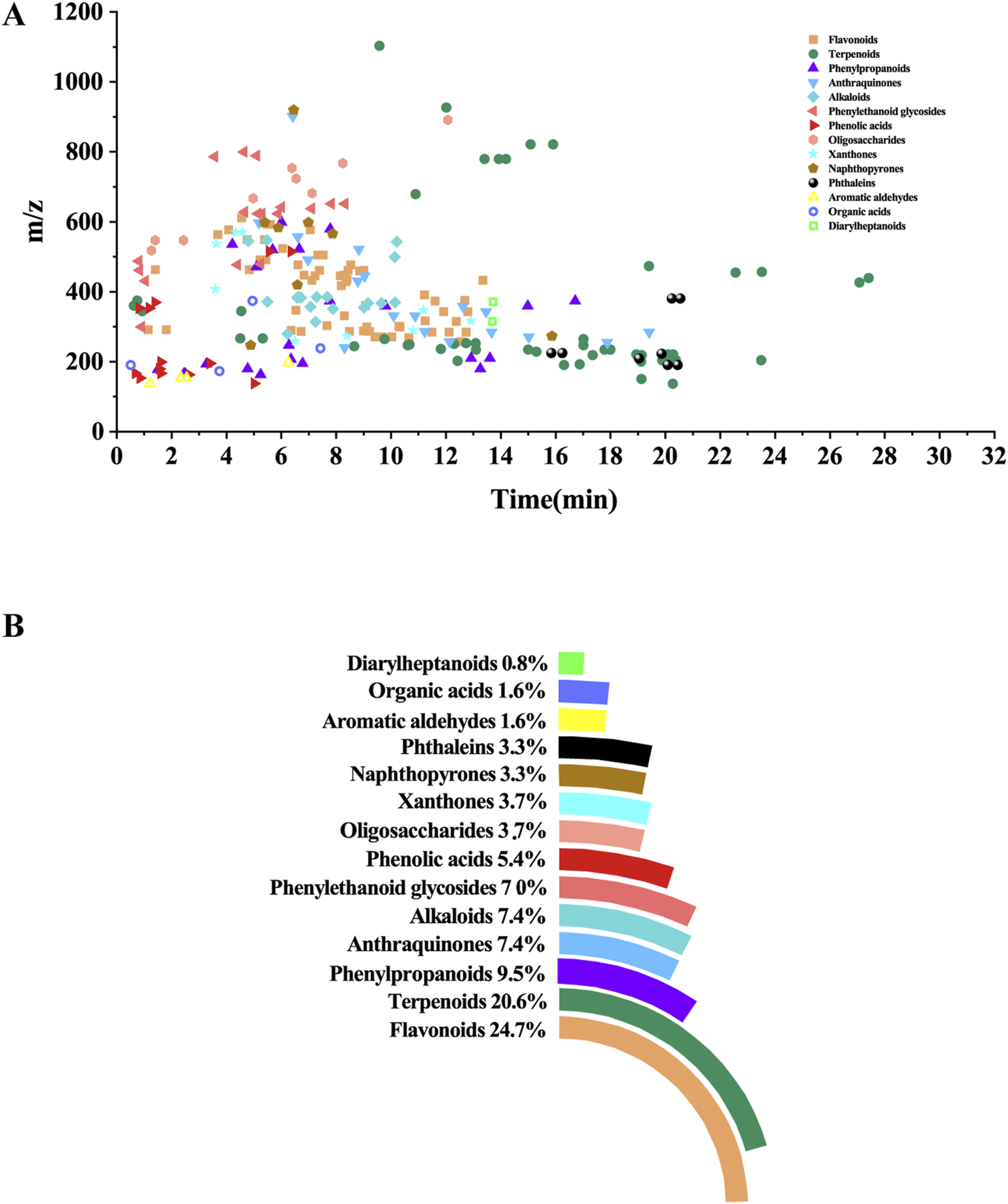 Distribution and chemical structure of 243 components characterized from ASDZL. (A) Distribution of retention time, accurate mass, and chemical structure in the scatterplot. (B) Proportion of 14 chemical structures from donut and pie chart.