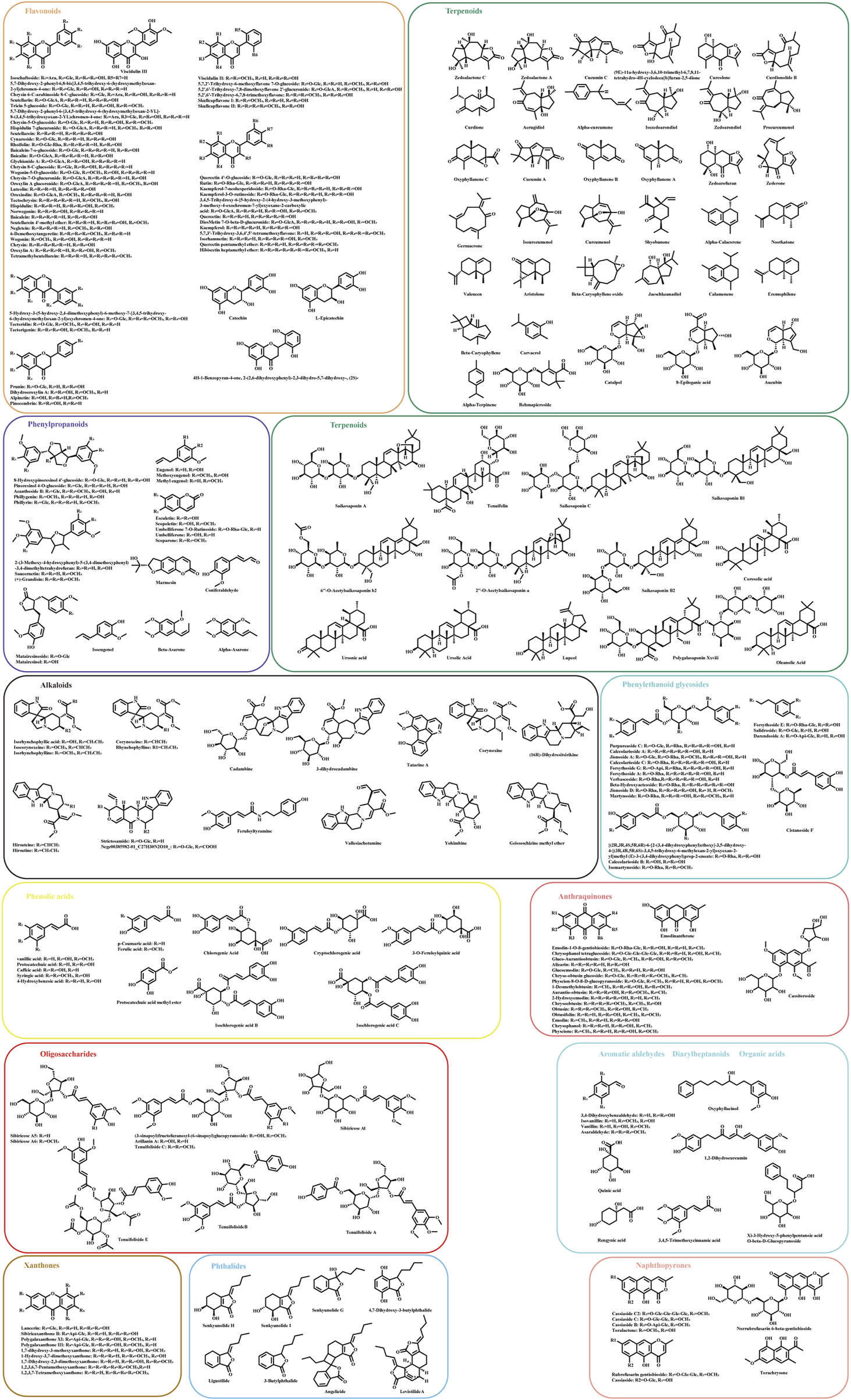 Multiple structure types were identified in ASDZL. Diagnostic ions and neutral losses of flavonoids, terpenoids, anthraquinones, alkaloids, phenylethanoid glycosides, oligosaccharides, xanthones, and phenolic acids were summarized based on the MS information of 11 reference standards and two components from the MN in the positive and negative ion modes (Supplementary Table S2). Diagnostic ions are mainly obtained for retro-Diels–Alder (RDA) cleavage, losses of glycosides, and specialized skeletons. Neutral molecules were mostly glycosides, H2O, and CO (van Dinteren et al., 2021).