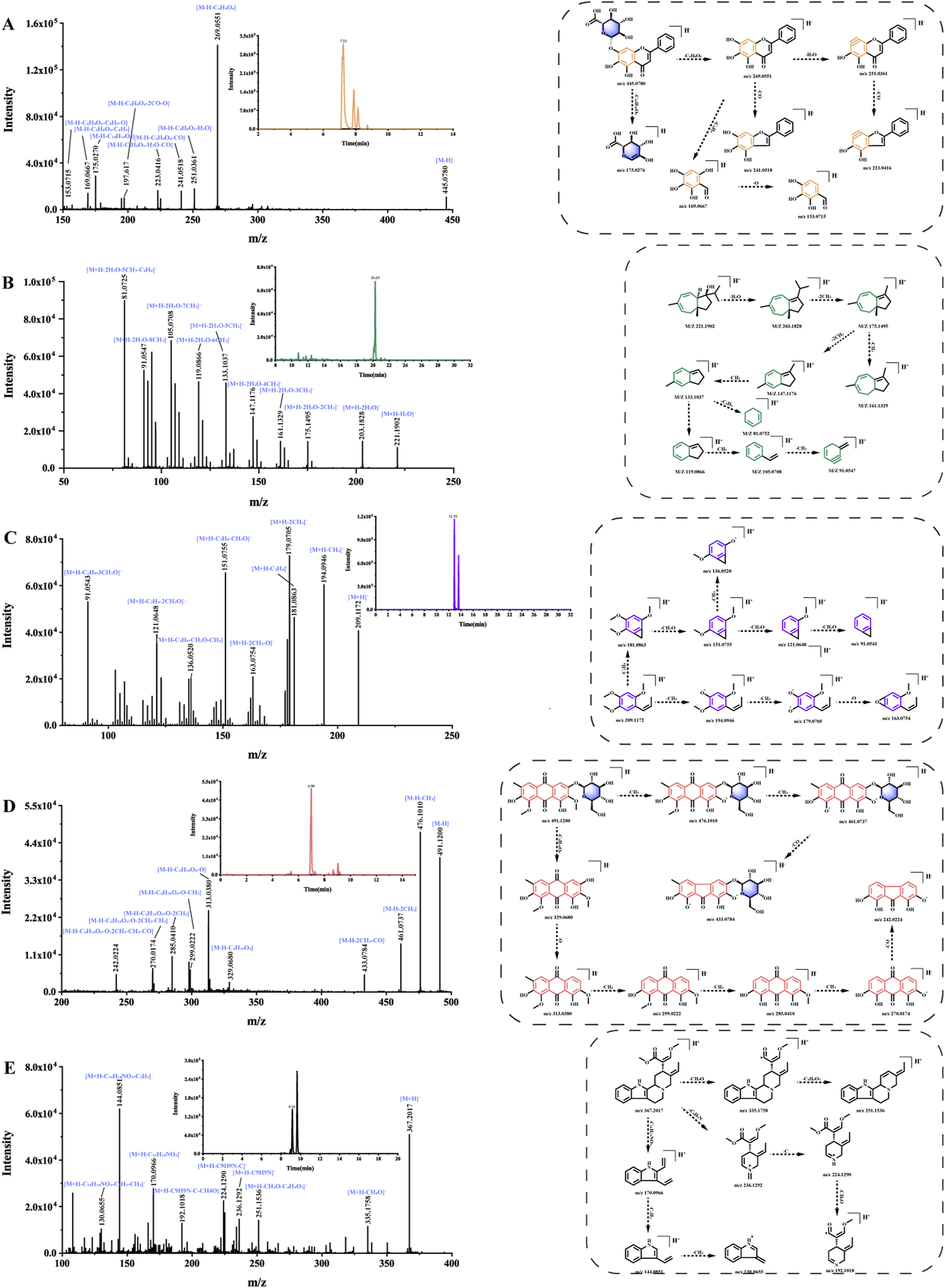 Fragmentation routes of the main components of ASDZL: (A) baicalin, (B) jaeschkeanadiol, (C) β-asarone, (D) geissoschizine methyl ether, and (E) glucoaurantio-obtusin.