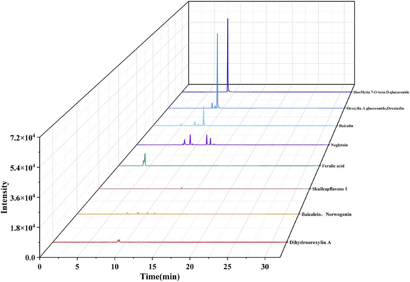 | P17 | 7.34 | Baicalin* | C21H18O11 | [M–H]- | 445.0776 | 445.0777 | 0.22 | 269.0461, 251.0346, 241.0511, 223.0406, 175.0250, 169.0661 | + | + |