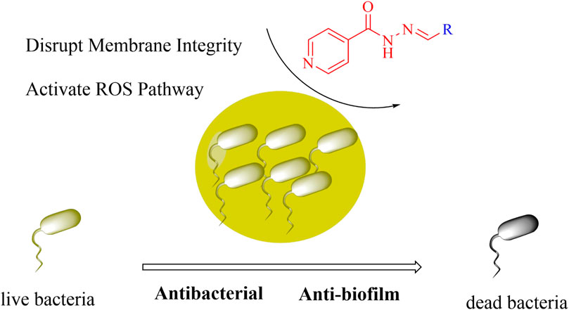 Therefore, this study adopted a molecular hybridization strategy. Condensing isoniazid with aromatic aldehydes to form Schiff bases. The introduced aromatic aldehydes serve as hydrophobic groups to enhance lipophilicity, thus improving the ability to penetrate the thick peptidoglycan layer of Gram-positive bacteria. This approach led to the discovery of compound C5 (N'-(2-hydroxy-5-nitrobenzylidene)isonicotinohydrazide), which exhibits potent antibacterial activity. Compound C5 rapidly eradicates Staphylococcus aureus by disrupting cell membrane integrity and activating the endogenous ROS pathway (Figure 1). This work provides a chemical entity (NCE) for developing drugs against drug-resistant Gram-positive bacteria. Furthermore, it establishes a theoretical foundation for the rational design of Schiff base-based antibacterial agents.