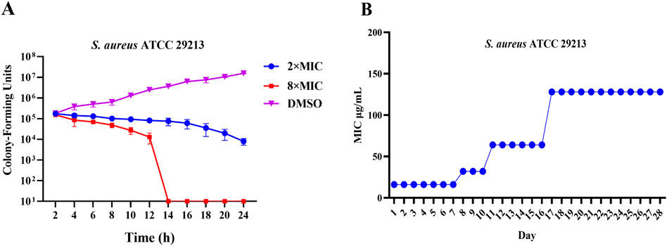 Figure 2. (A) Time-kill kinetics of C5 against S. aureus ATCC 29213. (B) Resistance development of C5. Data are presented as means ± SEM (Standard Error of Mean) from three independent experiments.