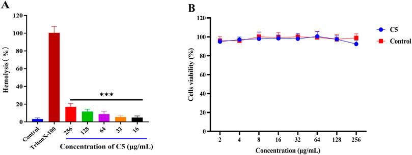 To evaluate compound safety, hemolysis assays were first performed for all test compounds. A 1% Triton X-100 solution served as the positive control, and sterile PBS was used as the negative control. As shown in Figure 3A, no hemolysis was observed for compound C5 across the concentration range of 2–256 μg/mL. This indicates that C5 exhibits no hemolytic activity against rabbit erythrocytes at concentrations effective for its antibacterial action. Subsequently, the cytotoxicity of the active compound C5 against African green monkey kidney (VERO) cells was assessed using the CCK-8 assay.The results (Figure 3B) demonstrate that C5 exhibited no cytotoxicity towards VERO cells at concentrations up to 256 μg/mL.
