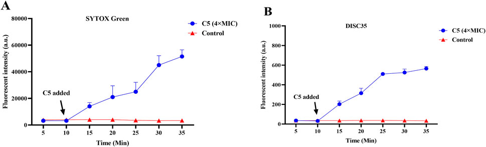 Studies indicate that the antibacterial activity of Schiff base compounds is associated with their hydrophobic interactions (Caldés et al., 2013; Hong et al., 2025). Based on the Schiff base group and hydrophobic characteristics inherent in compound C5’s structure, we hypothesized that it likely exerts its antibacterial effect by targeting the bacterial cell membrane. The specific mechanism may involve inducing alterations in membrane depolarization and permeability. To investigate the direct impact of C5 on the bacterial membrane, this study employed fluorescent probes: The cationic dye 3,3′-dipropylthiadicarbocyanine iodide (DiSC35) was used to monitor changes in bacterial membrane potential (depolarization). The nucleic acid stain SYTOX Green, which cannot penetrate intact cell membranes, was utilized to assess changes in membrane permeability (integrity), evaluating C5’s disruptive effect on membrane function.