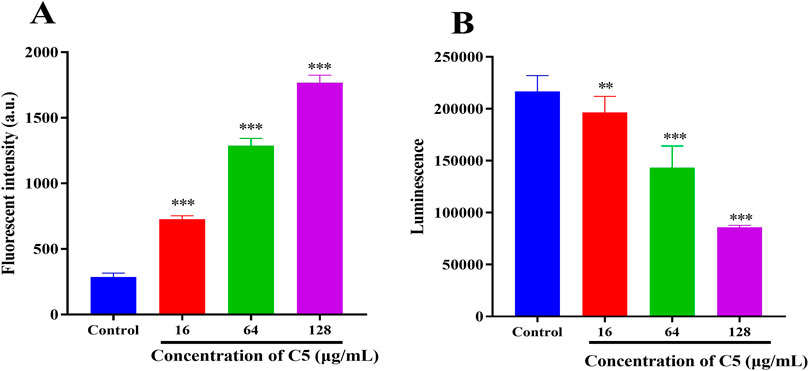 Figure 5. (A) Effect of C5 treatment on reactive oxygen species (ROS) production in S. aureus ATCC 29213. (B) Effect of C5 treatment on intracellular ATP levels in S. aureus ATCC 29213. *p < 0.05, **p < 0.01, ***p < 0.001. Data are presented as means ± SEM from three independent experiments.