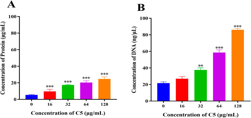 To further evaluate the impact of compound C5 on bacterial membrane integrity, we measured changes in the concentration of proteins and DNA in the extracellular culture medium of S. aureus ATCC 29213 following treatment with different concentrations of C5. The results demonstrated that compared to the blank control group, the concentrations of extracellular proteins and DNA were significantly elevated in the C5-treated bacterial suspensions. This effect occurred in a dose-dependent manner (Figures 6A,B). These findings directly demonstrate that C5 disrupts the cell membrane integrity of S. aureus ATCC 29213, leading to the leakage of intracellular contents (proteins and DNA).