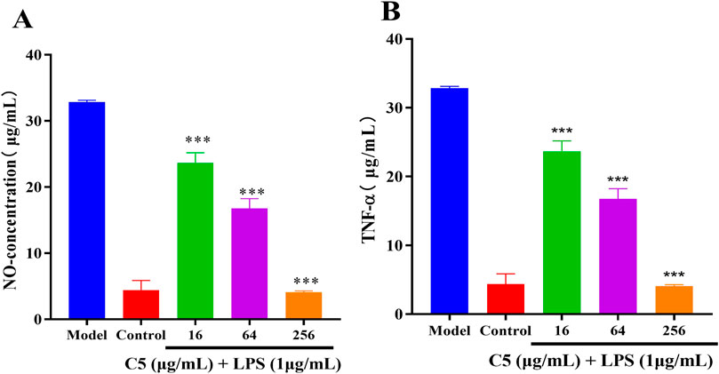 Inflammation commonly accompanies infections. Given that Schiff Base derivatives have been demonstrated to possess anti-inflammatory effects, we further evaluated the impact of compound C5 on the levels of inflammatory factors NO and TNF-α (Hu et al., 2022). As shown in Figure 7, compared to the control group, LPS stimulation alone significantly increased the production of NO and TNF-α in RAW 264.7 cells. However, treatment with compound C5 significantly suppressed this production. At a concentration as low as 64 μg/mL, compound C5 effectively reduced the generation of both NO and TNF-α.