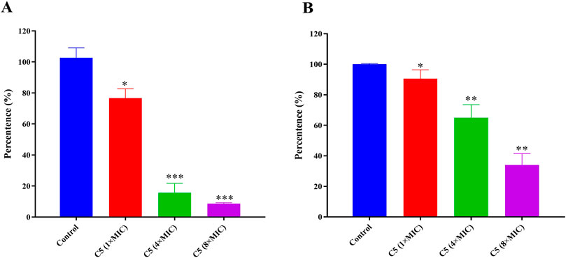 Figure 8. (A) Inhibition rate of C5 on S. aureus ATCC 29213 biofilm formation. (B) Biofilm dispersion of C5 on S. aureus ATCC 29213 biofilm. Difference is considered significant at *p < 0.05, **p < 0.01, vs. control group. Data are presented as means ± SD from three independent experiments.