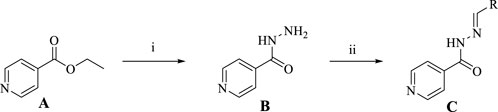 Scheme 1. Synthesis of Isoniazid derivatives. Conditions and reagents: (i) ethanol, NH2NH2, reflux, yield 86%; (ii) ethanol, different aldehyde groups, reflux, yield 81%–92%.
