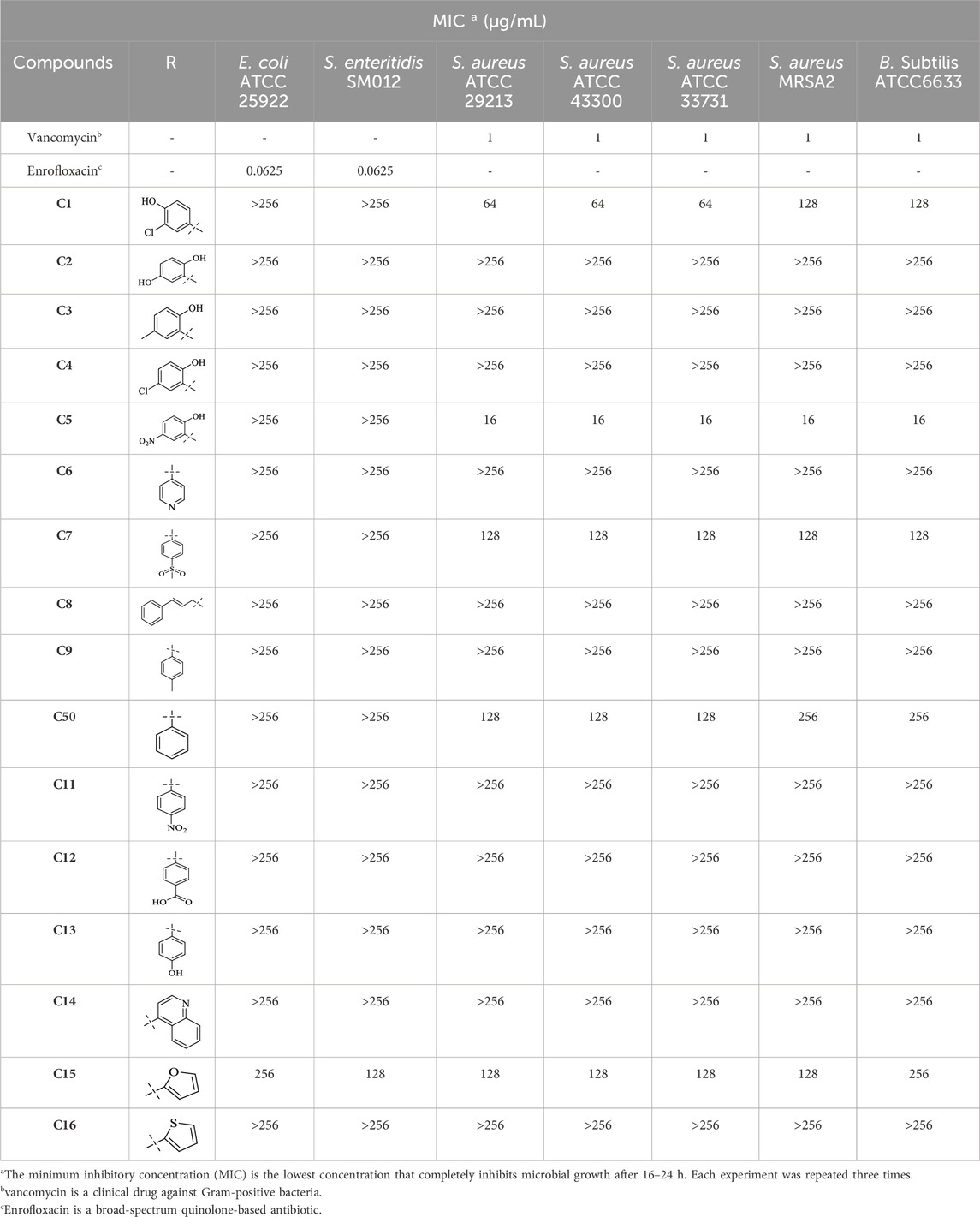 Reportedly, some Schiff base derivatives exhibit promising in vitro antibacterial activity (Hong et al., 2025). Therefore, this study employed the broth microdilution method to determine the in vitro antibacterial activity (MIC) against the following strains: Gram-positive bacteria: Staphylococcus aureus ATCC 29213, Staphylococcus aureus ATCC 43300, Staphylococcus aureus ATCC 33731, Staphylococcus aureus MRSA2, Bacillus Subtilis ATCC6633. Gram-negative bacteria: Escherichia coli ATCC 25922, Salmonella enterica serovar Enteritidis SM012. The antibacterial results for all compounds are summarized in Table 1. Among the tested compounds: C5 (16 μg/mL) exhibited inhibitory activity against all tested S. aureus strains. C1 (64 μg/mL) also inhibited all tested S. aureus strains. The remaining compounds demonstrated poor antibacterial activity, likely attributable to their overall poor solubility.