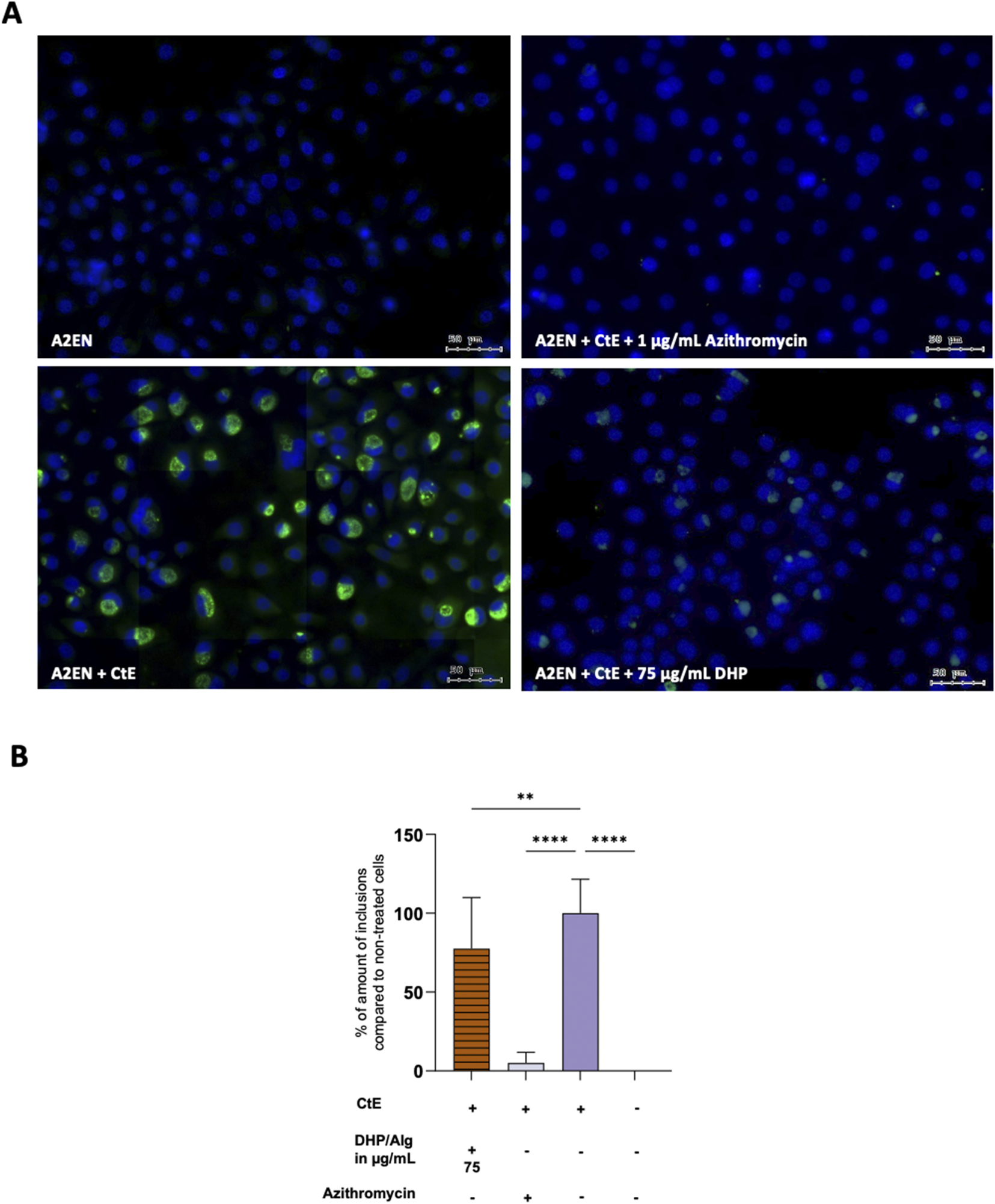 Infection assay via fluorescence microscopy. (A) Fluorescent images. A2EN (above panel, left), A2EN + CtE +1 μg/mL Azithromycin (above panel, right), A2EN + CtE (below panel, left), A2EN + CtE +75 μg/mL DHP/Alg (below panel, right). (B) Semiquantitative analysis of coverslips. The x-axis shows the different conditions while the y-axis shows the percentage of infection, with untreated cells set as the 100% infection baseline. A statistical test was done using a one-way ANOVA. The levels of statistical significance are indicated as *p ≤ 0.05, **p ≤ 0.01, ***p ≤ 0.001, ****p ≤ 0.0001.